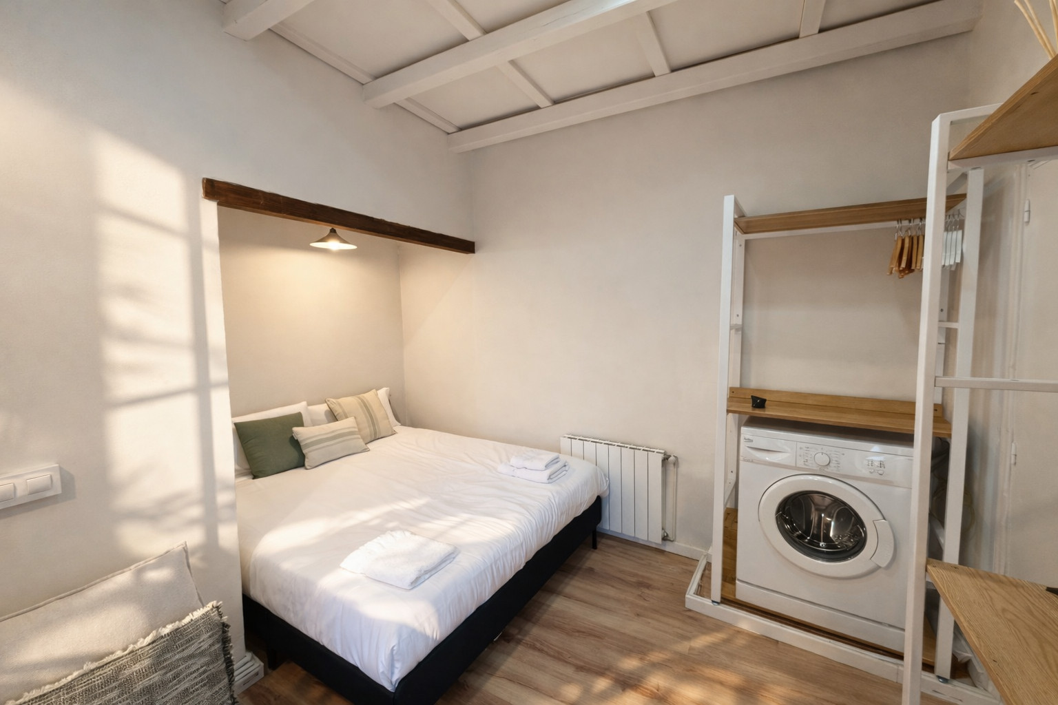 El estudio es pequeño pero bien aprovechado, está totalmente equipado y cuenta con una cocina abierta, perfecta para preparar tus comidas. La abundante luz natural hace que el estudio sea especialmente cálido y acogedor.