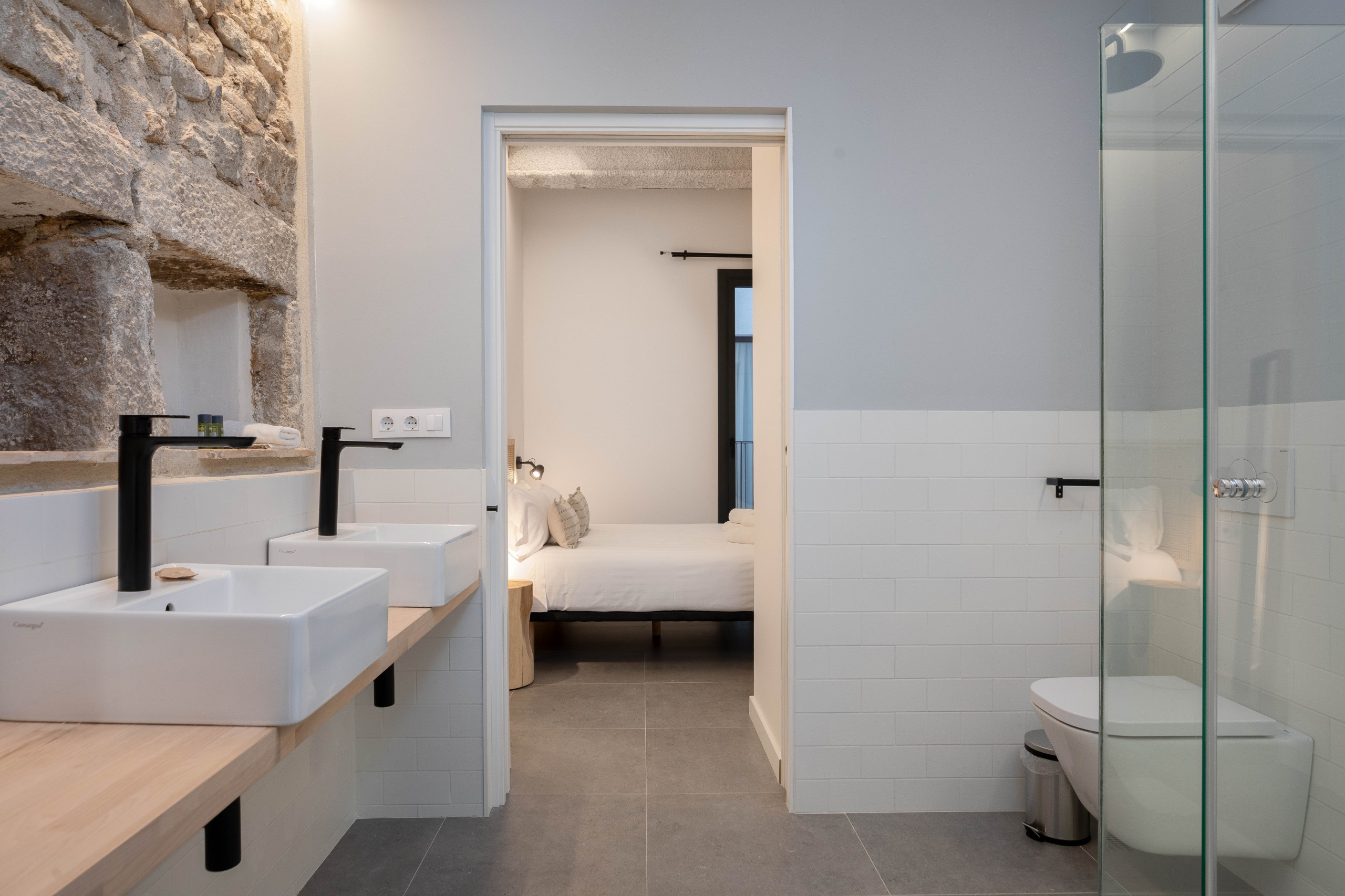 El alojamiento es totalmente nuevo, con unos acabados de suprema calidad y manteniendo el diseño tradicional del Barri Vell con sus preciosas paredes de piedra original . Cuenta con una habitación de matrimonio, una habitación doble abierta que conecta con el salón, un baño completo y una cocina totalmente equipada (lavavajillas, lavadora, horno, microondas.). Todo el alojamiento dispone de aire acondicionado e internet. El edificio tiene ascensor.