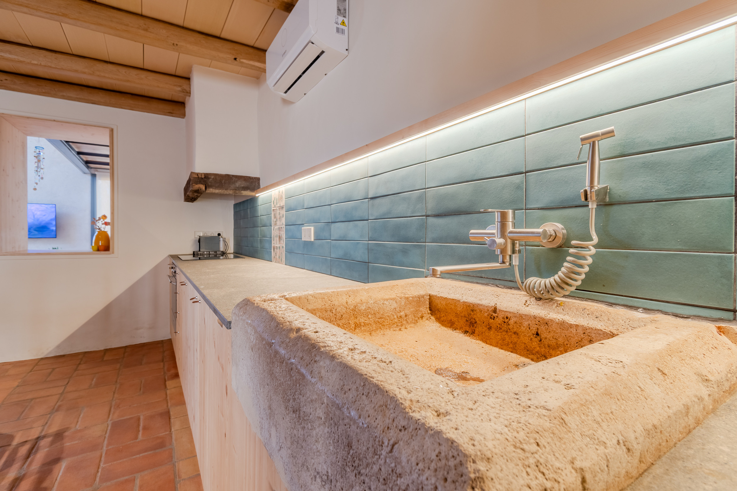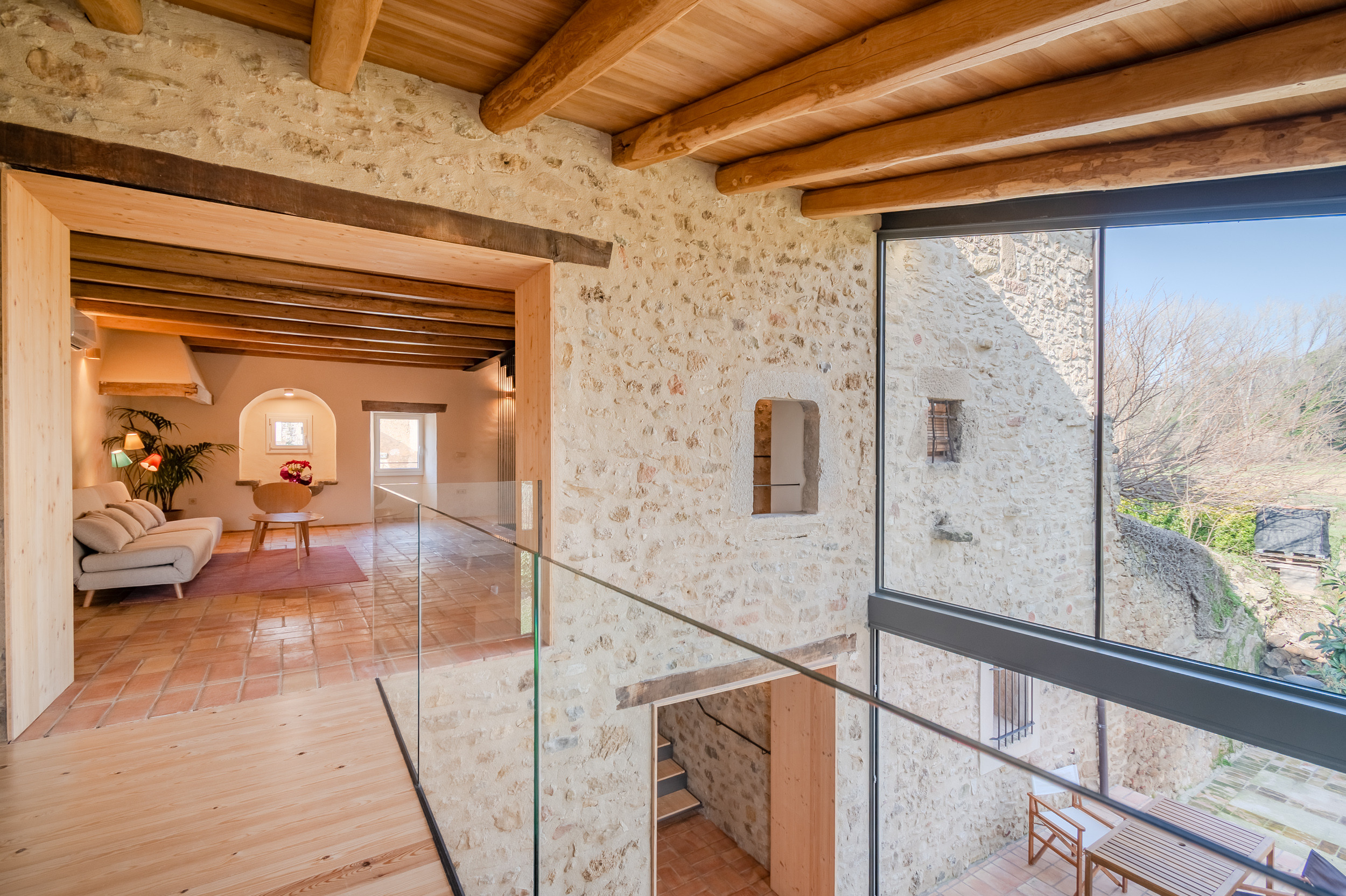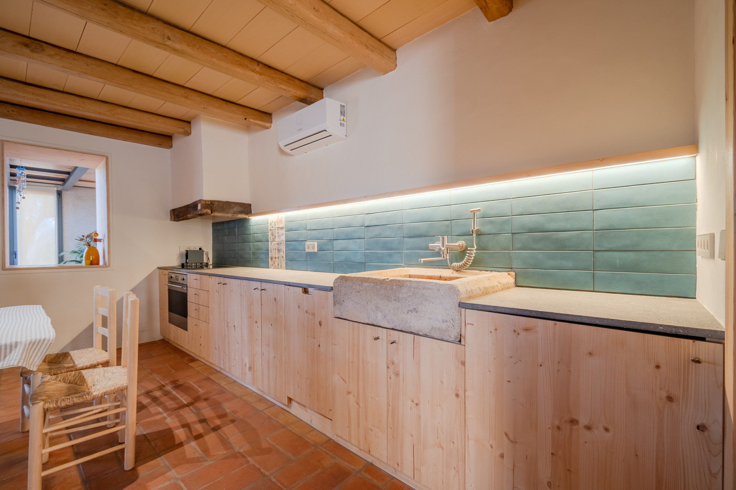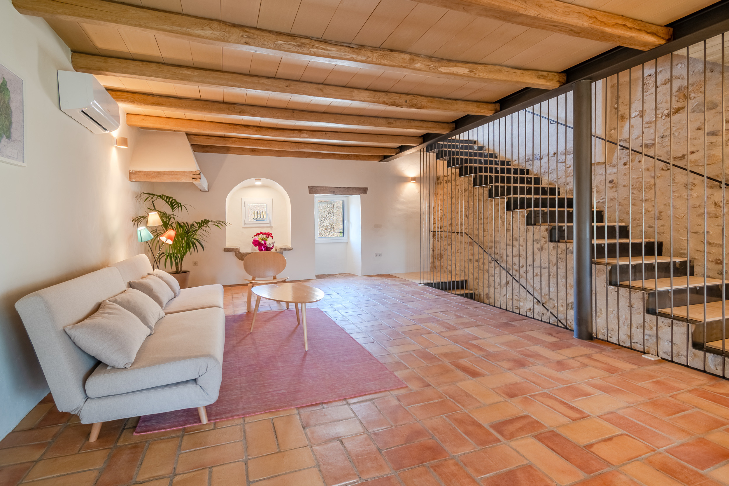 Acogedora casa rural de tres plantas situada en Cornellà del Terri, ideal para 4–6 personas, perfecta para desconectar en un entorno tranquilo y natural. En la primera planta se encuentran dos habitaciones: una con cama de matrimonio y otra con dos camas individuales, además de un baño completo. En la segunda planta hay una agradable sala de estar con sofá cama para dos personas, abierta visualmente al comedor de la planta baja, lo que aporta amplitud y luminosidad.