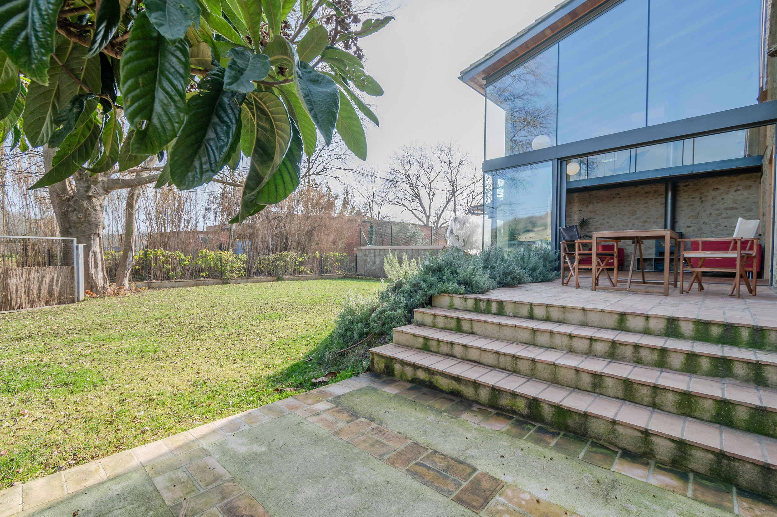 La planta baja dispone de una cocina moderna totalmente equipada y un espectacular comedor con paredes exteriores de cristal, chimenea y abundante luz natural. Desde el comedor se accede directamente a un patio privado de 400 m², con zona chill out y espacio rodeado de naturaleza, ideal para relajarse o disfrutar de comidas al aire libre.