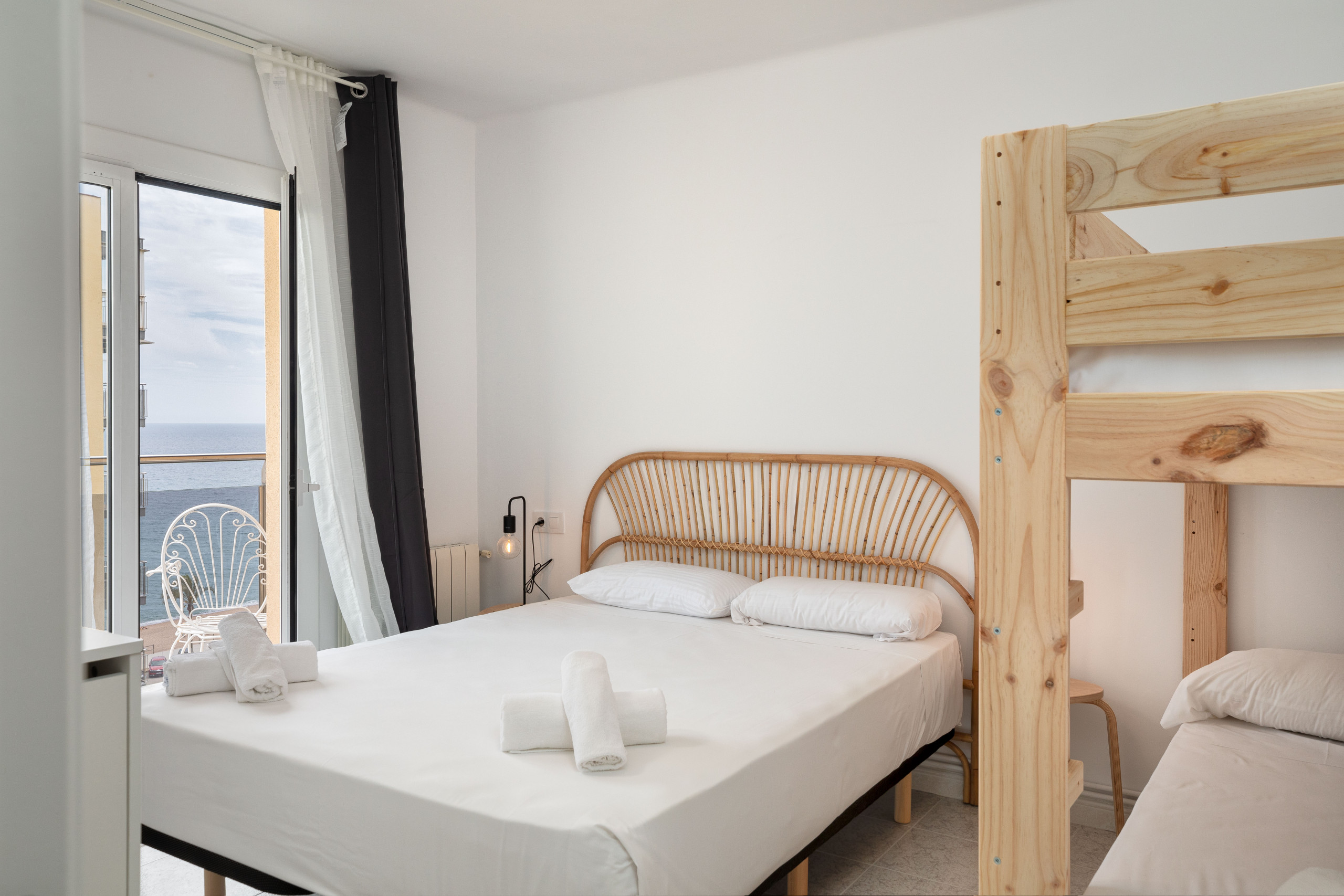 La habitación dispone de cama de matrimonio con vistas al mar y litera para dos personas.