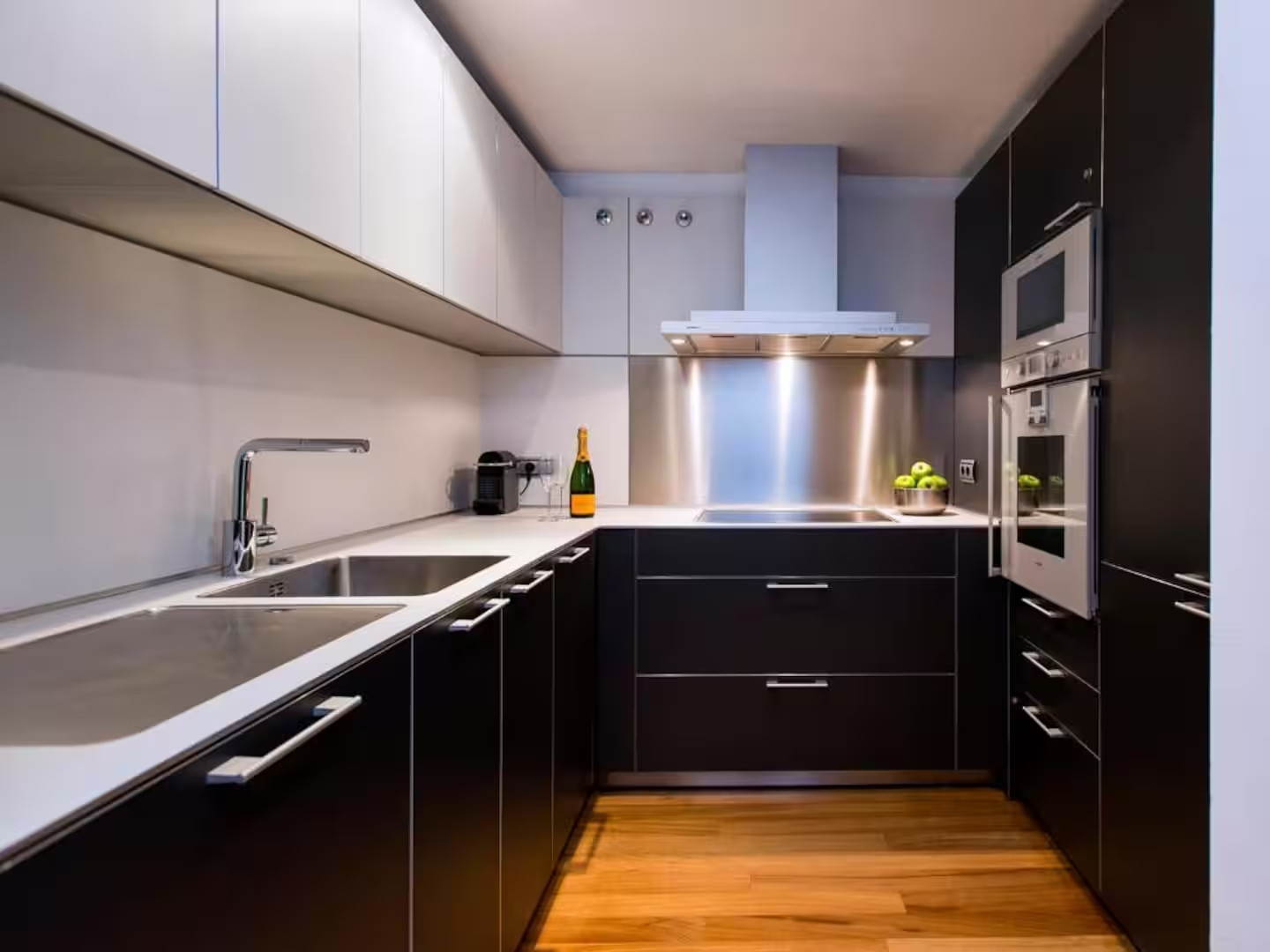 In the hotplate of glass ceramics independent kitchen, refrigerator, microwave, oven, freezer, dishwasher, dishes/cutlery, kitchen utensils, coffee machine, toaster and kettle are provided.