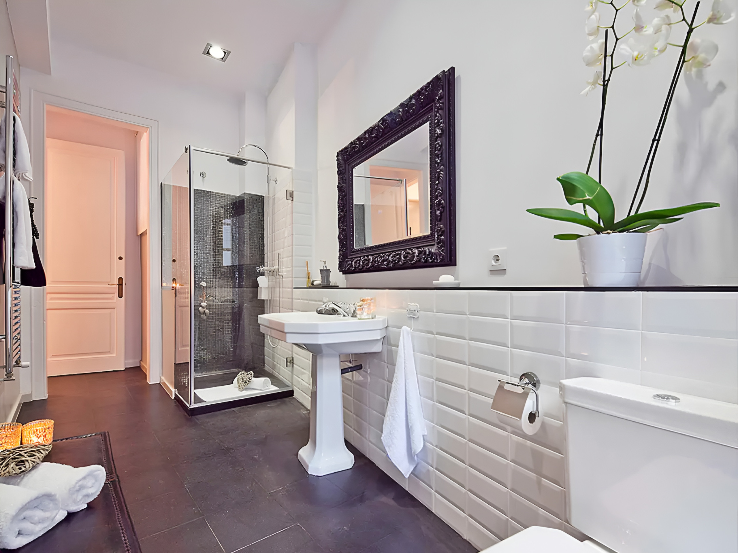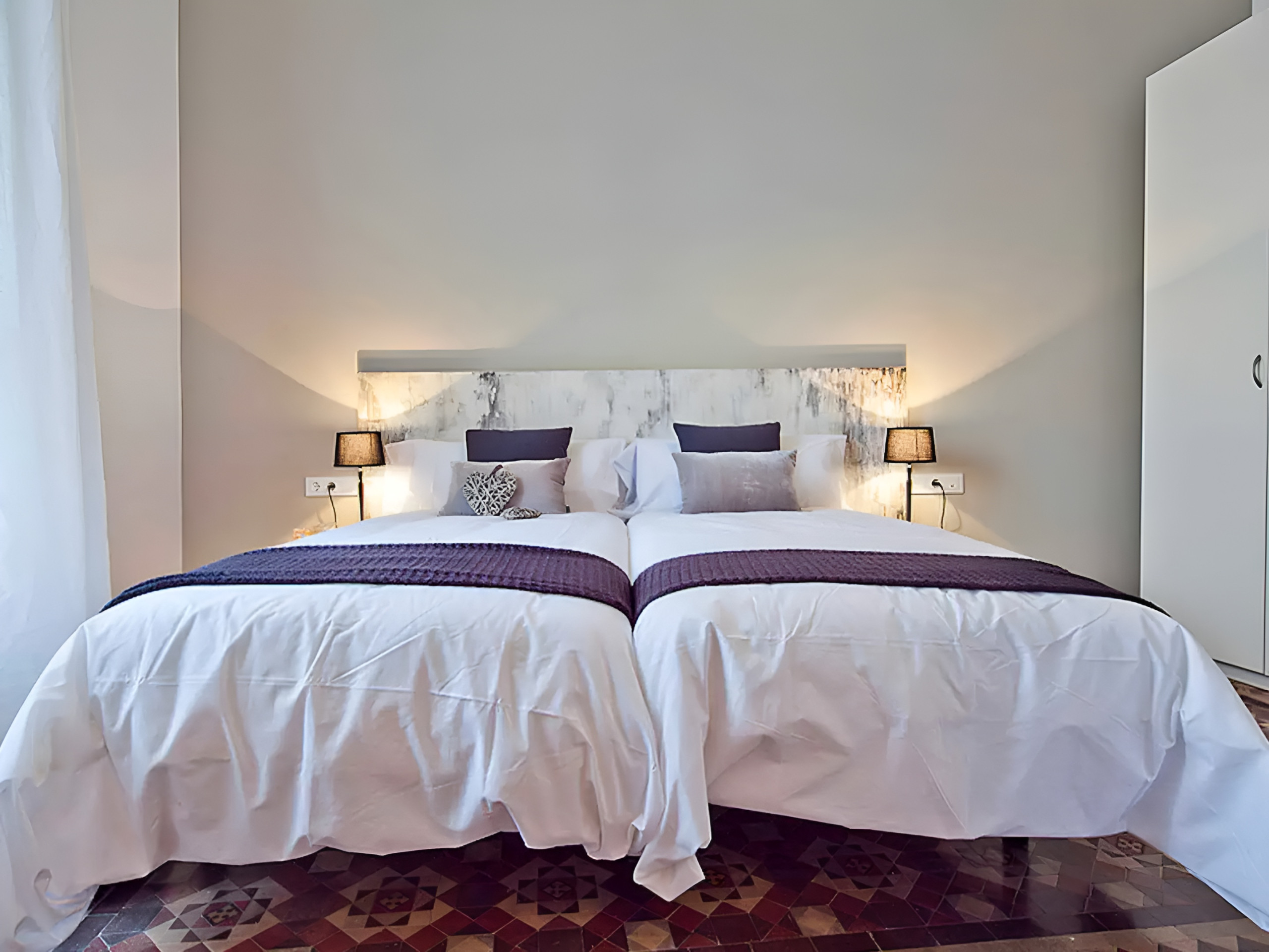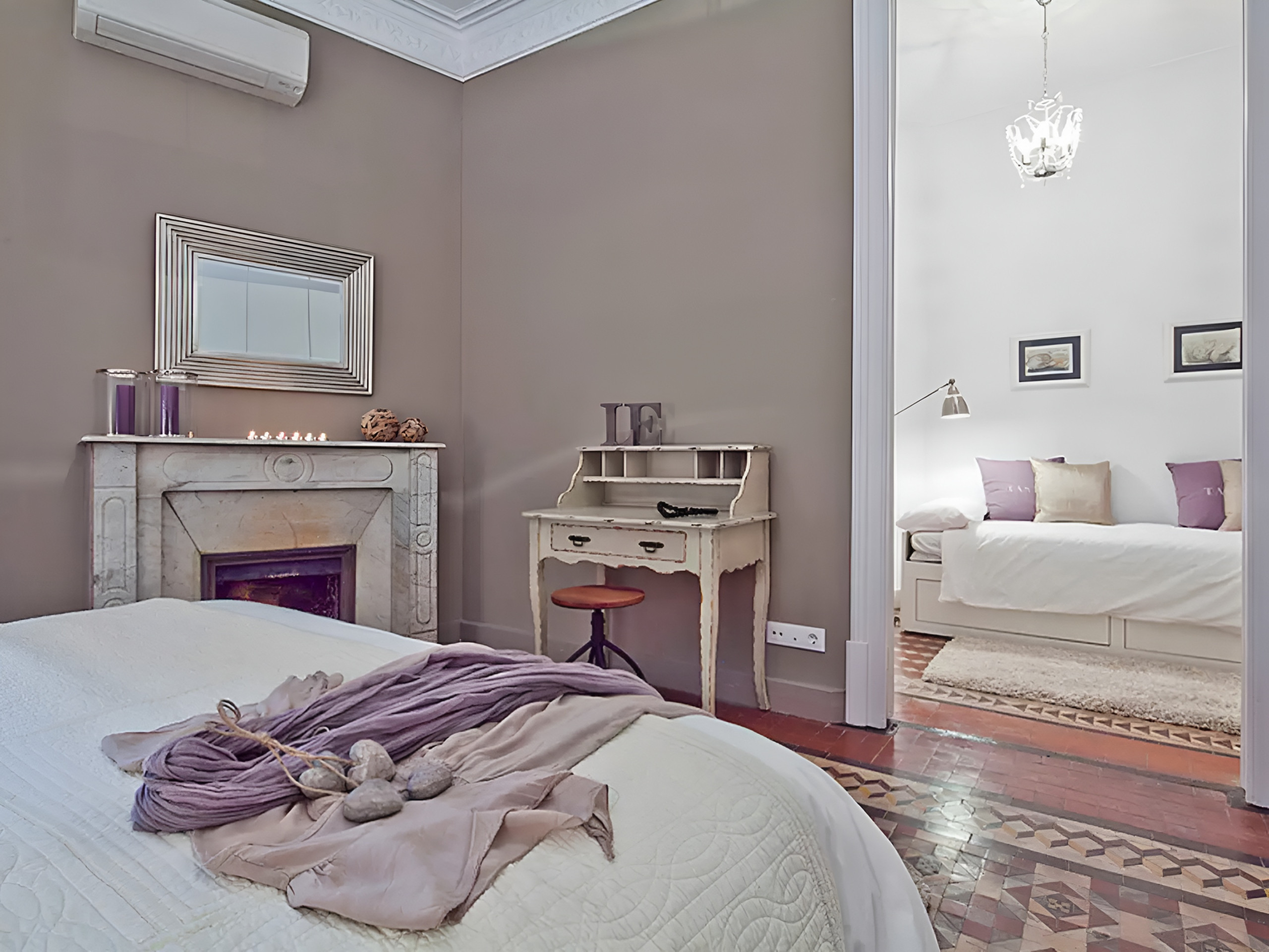 It has two double bedrooms with single beds of 90 cm x 1.90 m and a balcony with a view of Ronda Universidad. The third bedroom, a suite with a double bed, has a decorative fireplace and access to a quiet inner courtyard, ideal for relaxing. It also has an adjoining room with a trundle bed for one or two people, perfect for accommodating children.