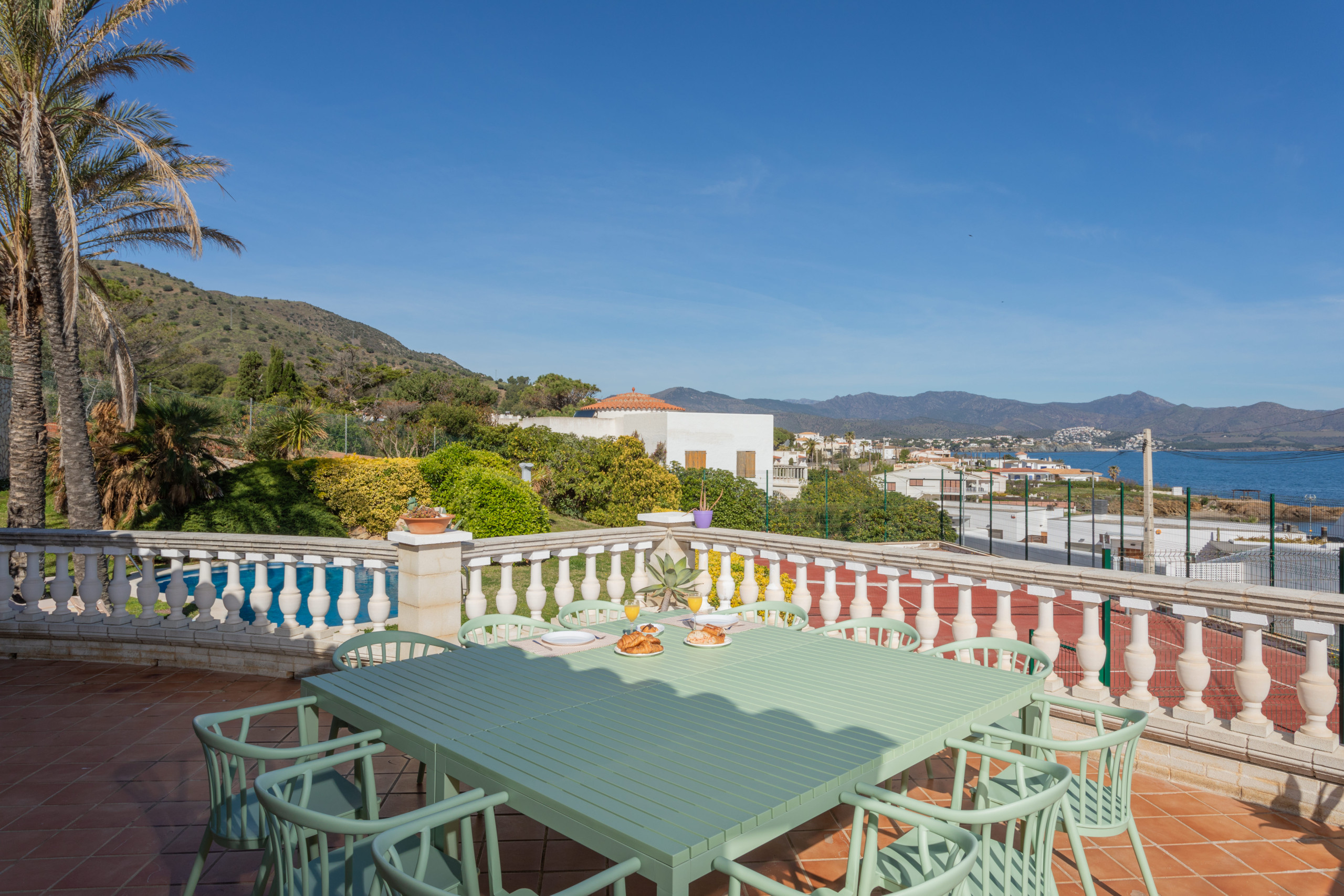 La villa dispose d'un immense jardin de pelouse avec piscine, bain à remous, court de tennis et de vastes espaces pour profiter du climat méditerranéen avec une belle vue sur la mer. La plage est à moins de 3 minutes à pied de la maison.
